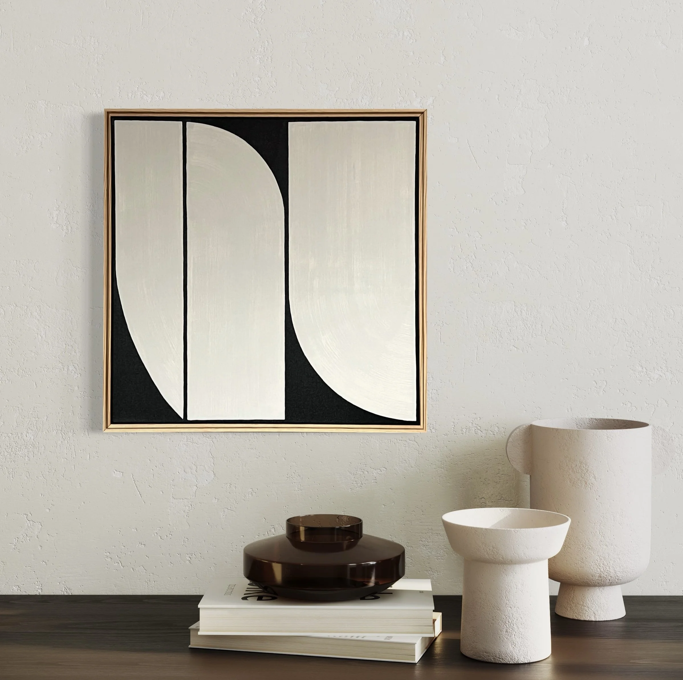 Inspired by the Bauhaus movement and Mid-Century design, the Elements / Fragments Series is an experimental study of the relationships between one, two or at most, three colors. It is a distinctive visual branch of knowledge characterized by geometric abstraction and an expressive application of paint. Some of the paintings feature colored shapes and forms that travel around the canvas, creating the illusion of infinite space. Bazinet employs geometric and minimal color combinations to create unique and seductive paintings.